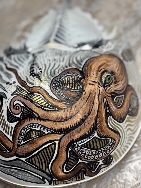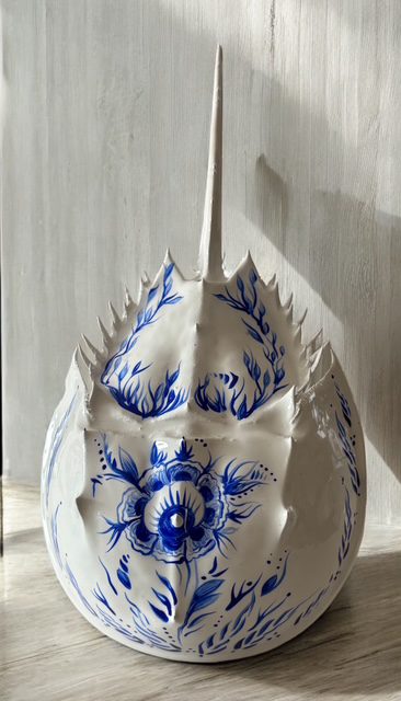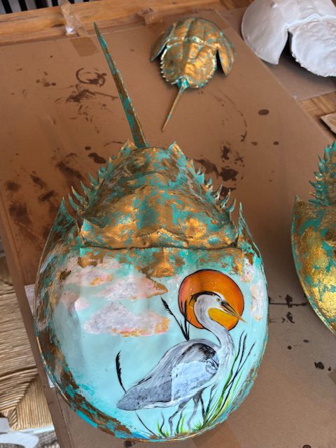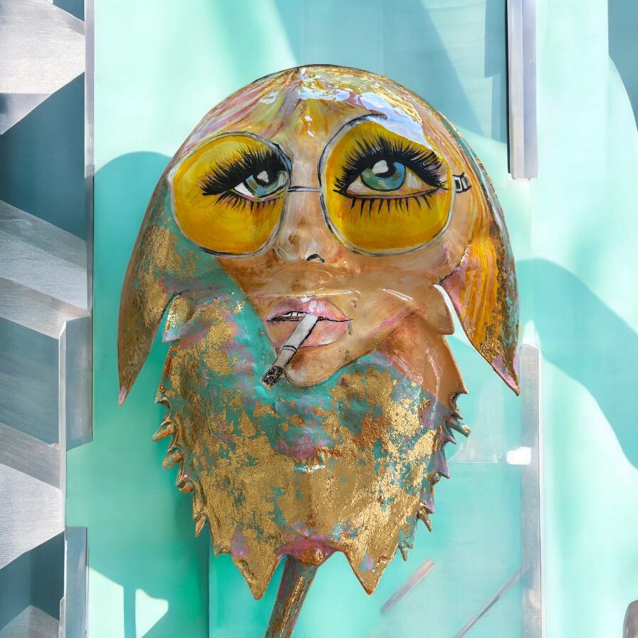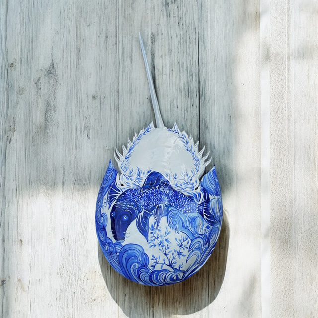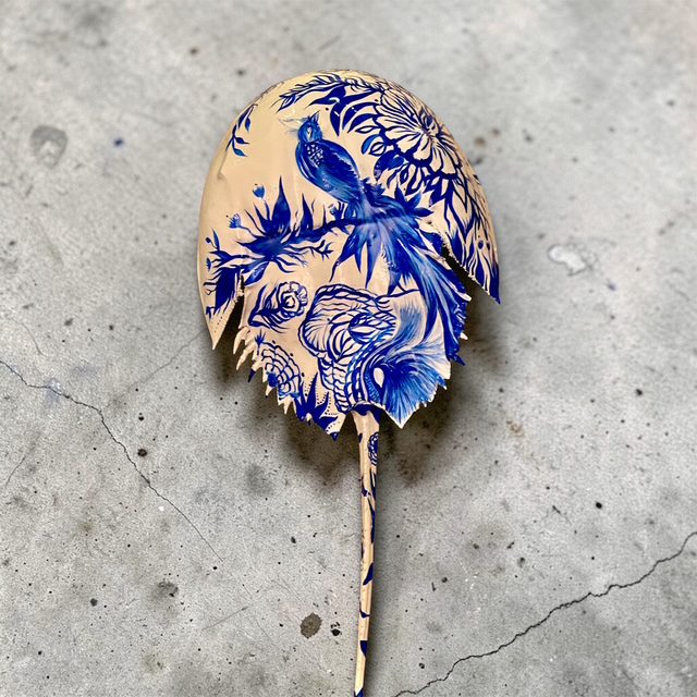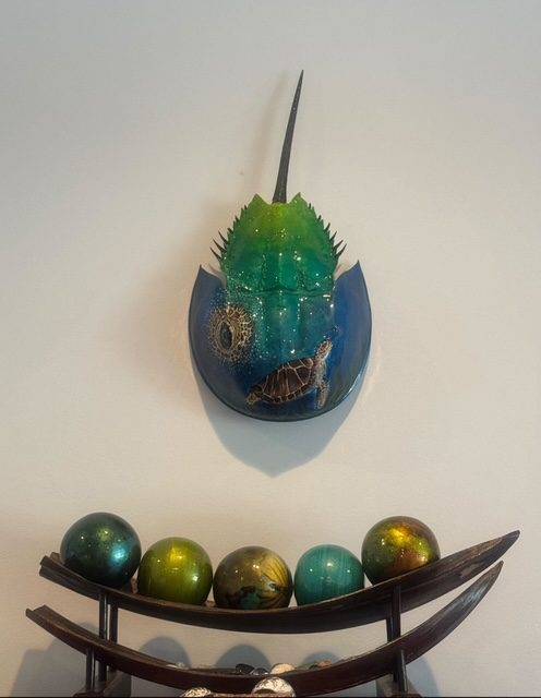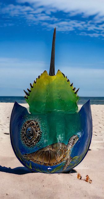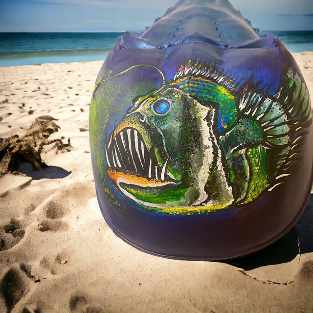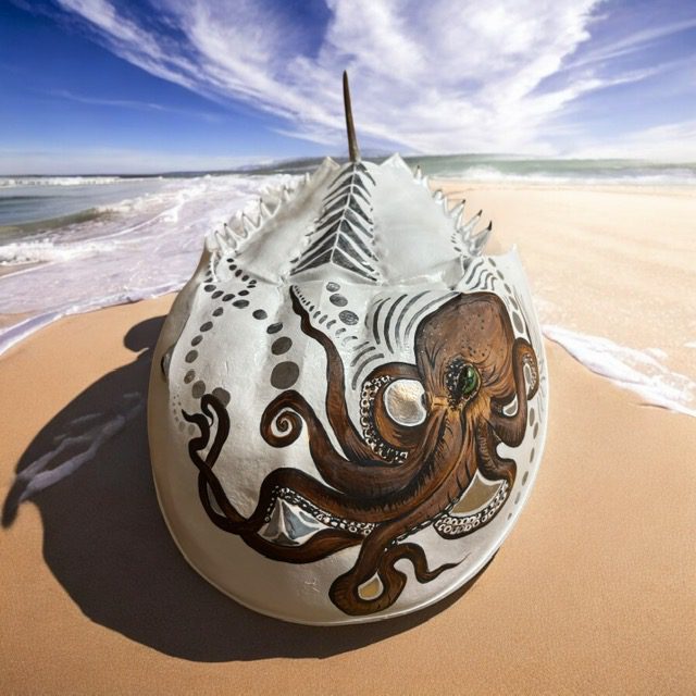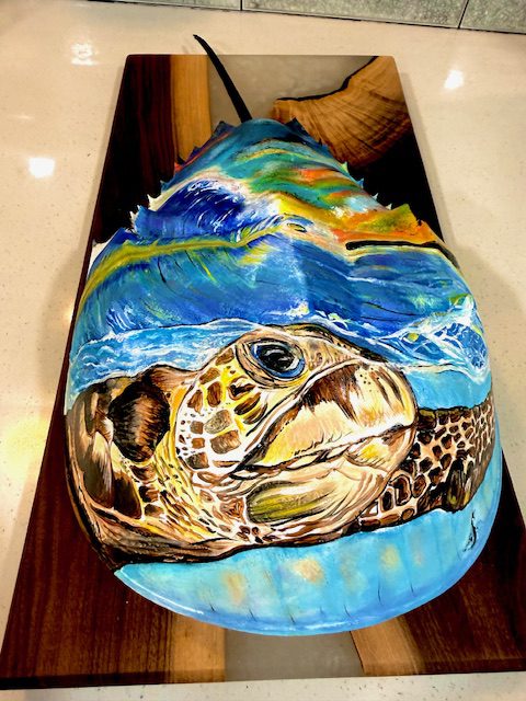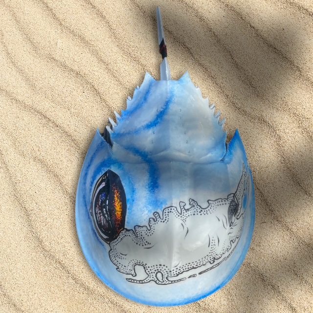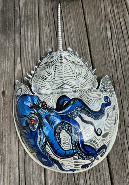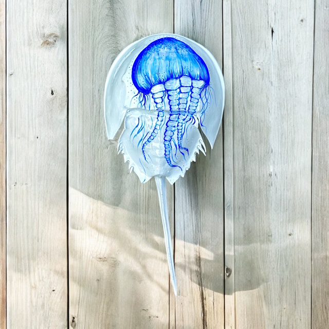 Each and every horseshoe crab used in my art is non-living and found washed up on the beaches of south shore Long Island. Usually already cleaned out by the seagulls, I clean, prime and prepare the crab in order to paint my next vision. After I paint the crab, it is then finished by applying epoxy via a paintbrush. The complete process takes days to create and hours to dry. This makes the crab able to withstand weather and handling and creates a beautiful coat. I am available for commissioned artwork, murals, and design services.